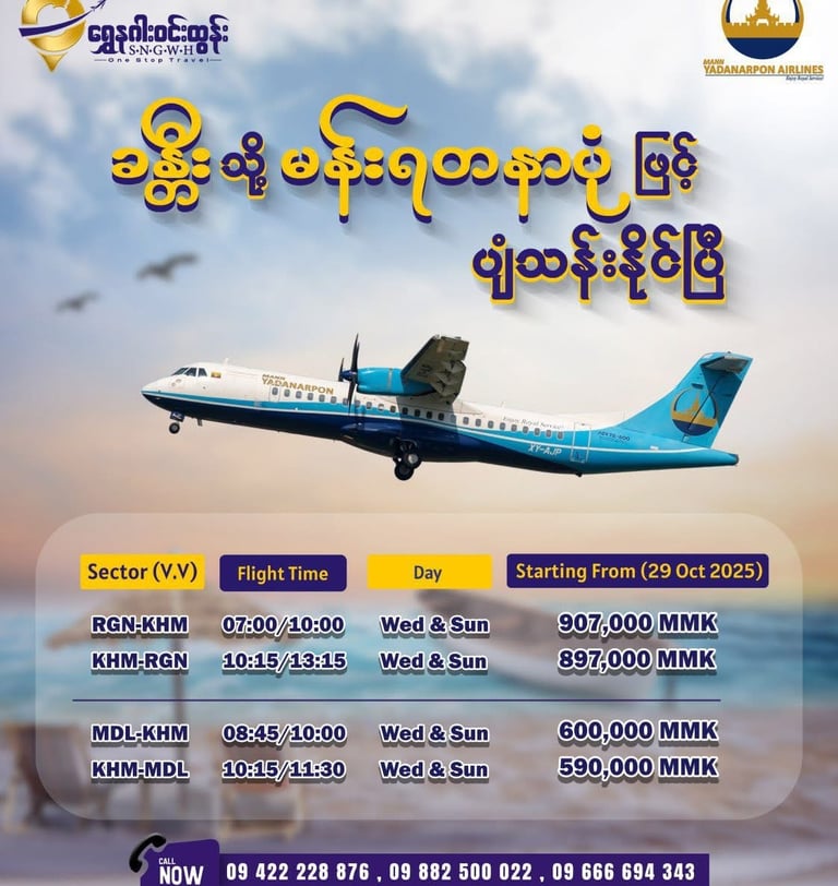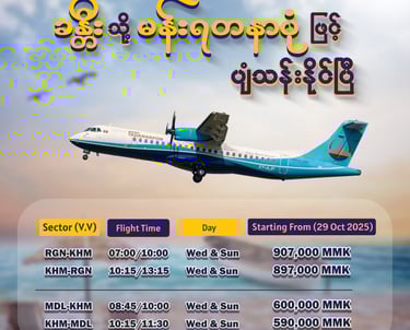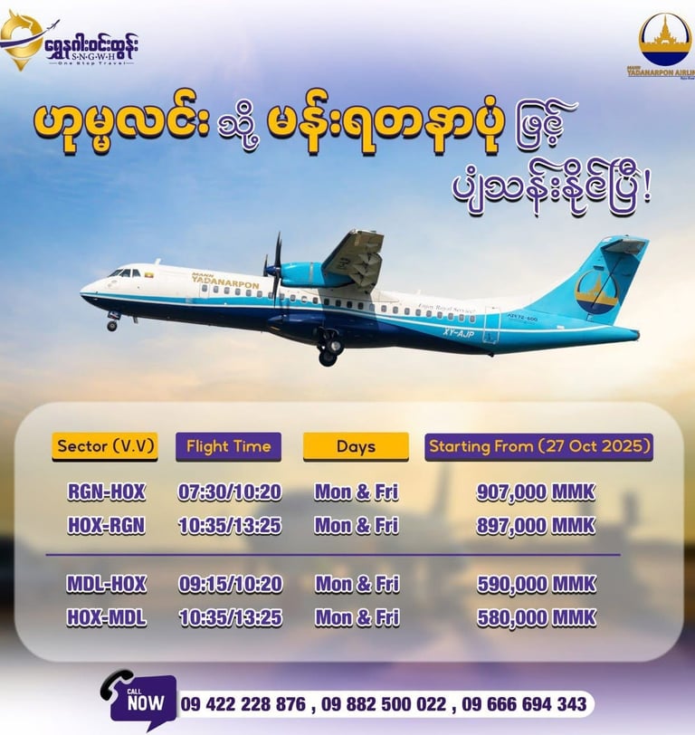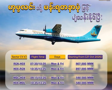 Fly to ဟုမ္မလင်းမြို့(HOX) and ခန္တီးမြို့ (KHM) with Mann Yadanarpon Airlines.